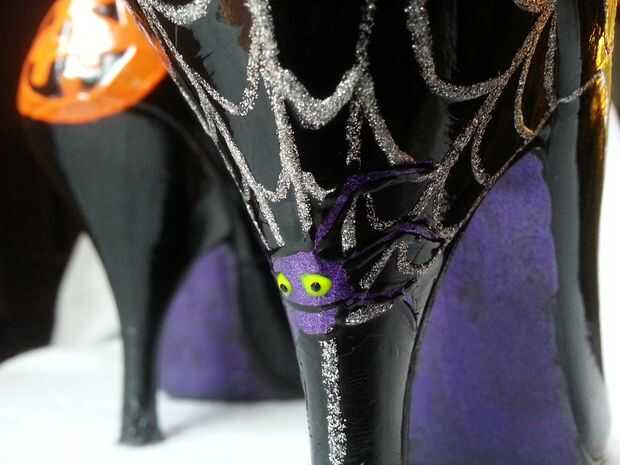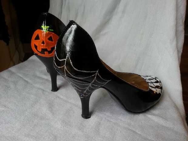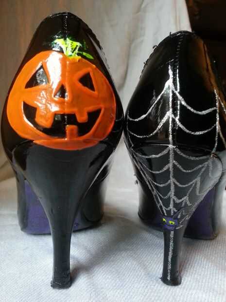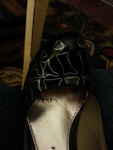 he pintado encima de unos tacones patente Beat-up después de ser inspirado por un cuadro en reddit. Iba a utilizar esmalte acrílico, que probablemente habría funcionado de maravilla, pero siendo este un arte de última hora, decidí usar esmalte de uñas. Fue tan fácil y tan bien! Yo busqué en Google "radiografía de pie" y libre las skele-toes con una plata gel pen (que destruyó justo si usted comete un error). Todos los huesos blancos sólo tomaron una capa; Sinceramente no podía creer que funcionó tan bien. La parte posterior de los talones era el resultado de demasiada cafeína y una sobrecarga del espíritu de Halloween la noche antes del gran día - yo sólo libre todo y resultaron mejor de lo esperado. Boo!