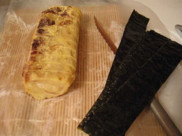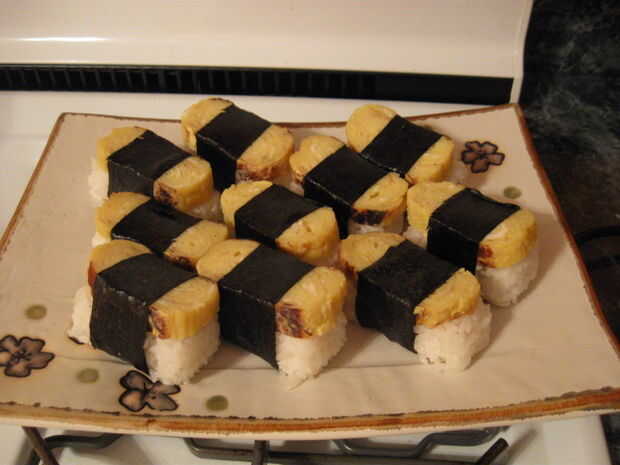 Ha sido dicho al ir a un sushi-ya, la primera cosa a intentar es un nigiri de tamago. Se ve como una almohada de arroz rematado con un rectángulo de huevos laminados (tamagoyaki) atado en el centro con una longitud de tiras de papel de nori. Los huevos se cocinan utilizando un recipiente rectangular – sartén tamagoyaki.