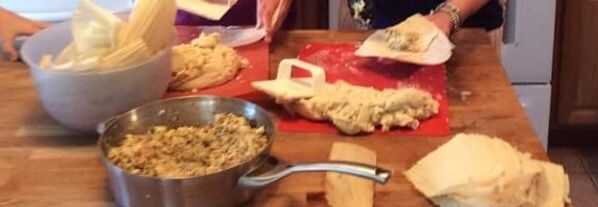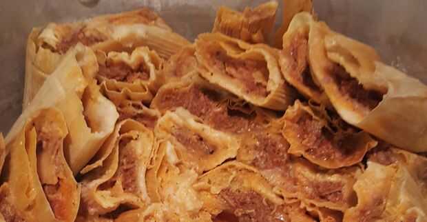 Alternativamente añadir mezcla de masa de harina y caldo a la manteca, batiendo bien después de cada adición. (Agregar el suficiente caldo para hacer una goma gruesa y cremosa). Por el momento, remoje las hojas de maíz en agua tibia durante al menos 20 minutos; enjuague para eliminar cualquier seda de maíz y escurrirlas bien.