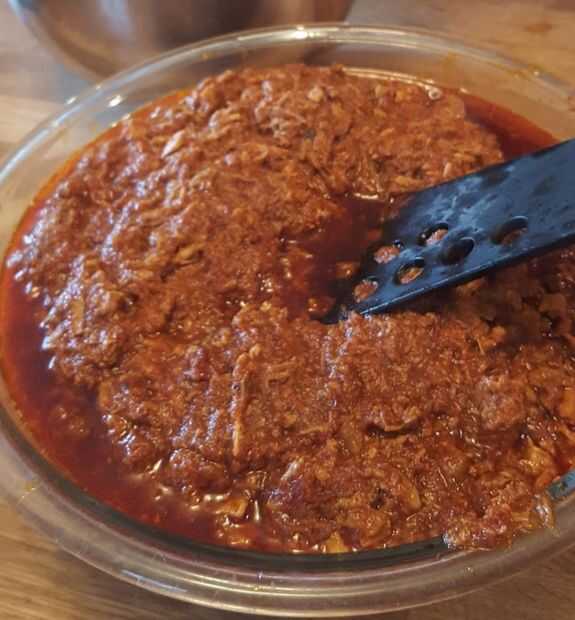En una cacerola grande, calentar la salsa de Chile rojo y agregar la carne; cocinar a fuego lento, cubierto por 10 minutos. Para hacer la masa batir manteca a velocidad media en un tazón grande durante 1 minuto.