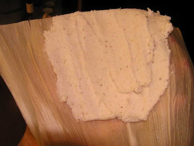 Si encuentras que te estás quedando sin hojas grandes, usted puede duplicar 2 cáscaras más pequeñas, asegúrese de que el tamal se envuelve lo suficiente.