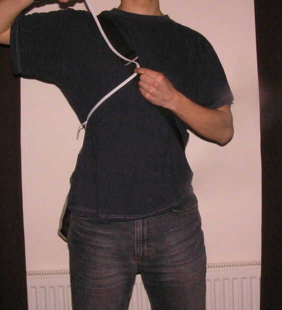 La grapa para el arillo, ponga la bolsa y medir cuánta cadena necesita. La cadena debe funcionar libremente (pero no demasiado) de la bolsa de la correa y cumplir con la correa en aproximadamente 90 grados, en el área áspero de su esternón (esternón).