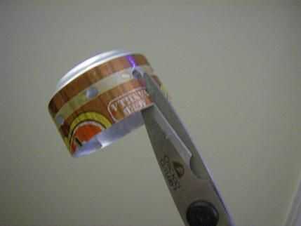 2.) utilizando la perforadora, punzón 8 agujeros uniformemente espaciados aproximadamente 1/4 de una pulgada (o 1 cm) abajo de la curva en la parte superior de la estufa. Entonces, usando las tijeras, cortadas una línea desde la parte inferior de cada uno de estos agujeros. (Imagen 2) Los agujeros mantendrá la puede seguir partido a lo largo de la línea que se corta. Las líneas de corte permiten fácilmente insertar la tapa en la parte inferior.