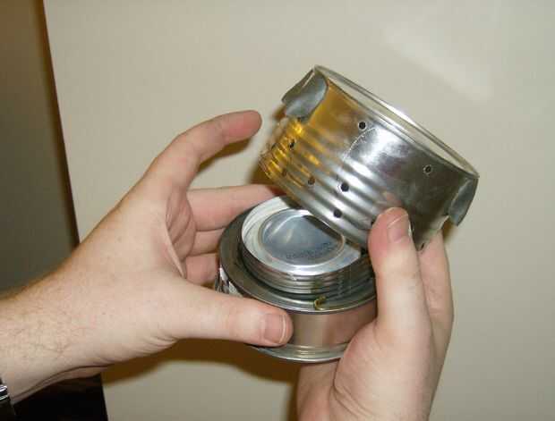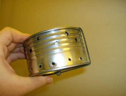 3.) la Penny Stove en la medición de la taza boca abajo y coloque el protector de viento sobre el aparejo entero. Si usted hace un gancho para sujetar la bandeja, esto puede también poner en este momento. (Imagen 3)