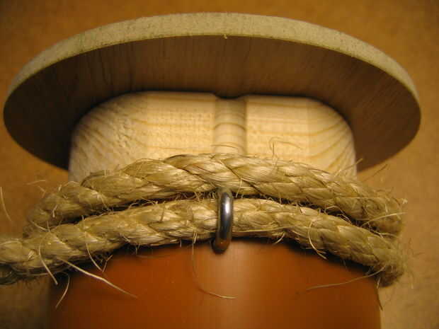 Poner un nudo en la cuerda, dentro del tubo, cerca de la clavija. Guía de la cuerda por el cut-out. Montar las tuercas de la abrazadera y apriete la cuerda. Presione el tapón y comenzar a envolver la cuerda de la unidad de enchufe de piso y.