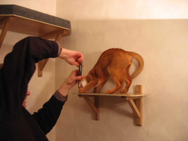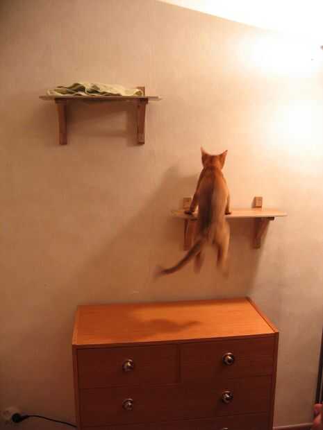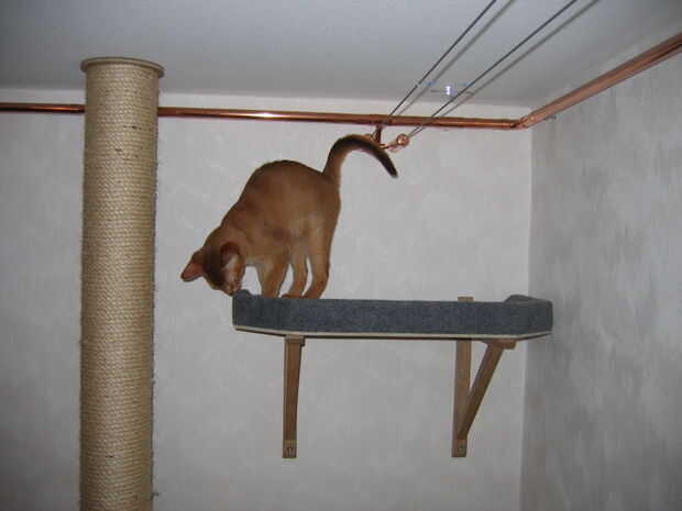 Para que sea más fácil para el gato que bajara de la plataforma, Monte dos estantes adicionales a la pared, y actúan como una escalera. Sugiere dimensiones plato: longitud = 450 mm y ancho = 170 mm. Una distancia de 450 mm entre cada paso parece adecuada para un gato joven.