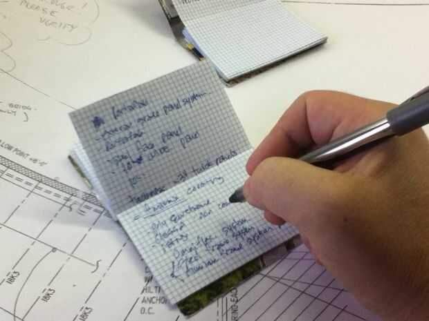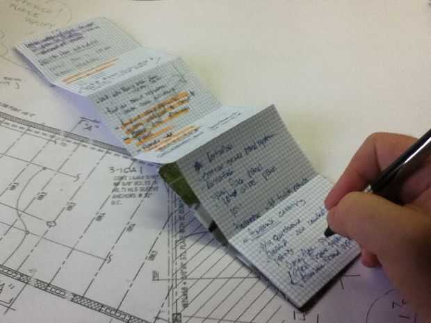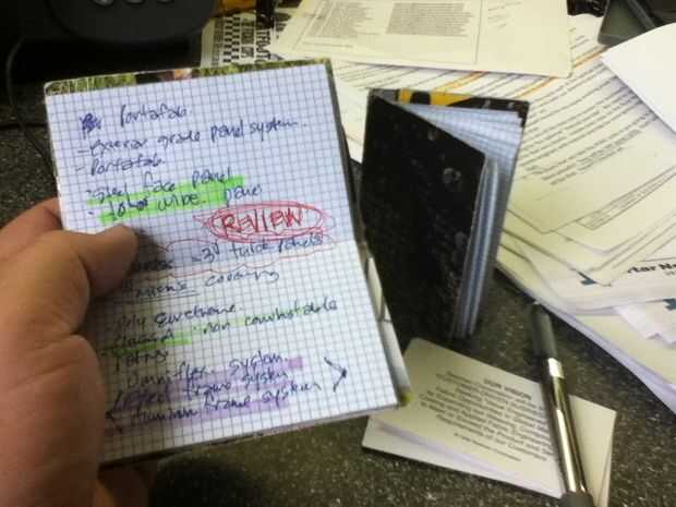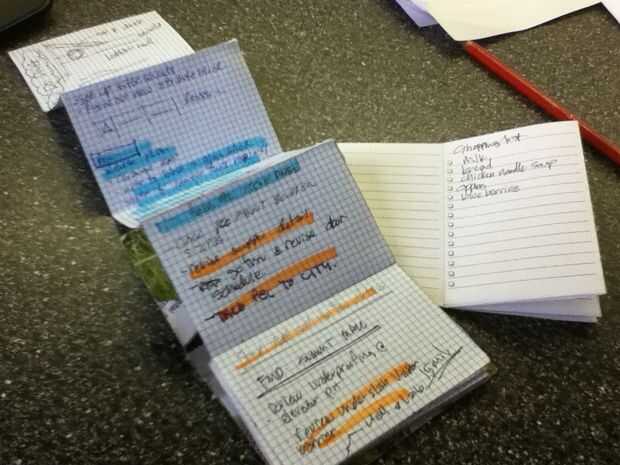 Por lo hacen las listas de PocketMod realmente no funcionan. Las hojas son en vertical (retrato) que no da mucho espacio para cada elemento. Esto funciona muy bien para una cosas sencillas como una lista de compras, pero no se si necesita escribir más de 4 palabras. Mis listas son muy descriptivos y mucho de esbozo... una imagen vale 1 mil palabras. También guardo todas mis listas de modo que hay una historia de las decisiones y cambios que se han hecho. Constantemente me refiero a esta historia posterior.