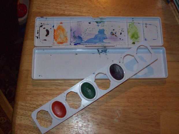 Para el kit de color de agua. Vas a necesitar un conjunto de colores de agua que caben en el caja o receptáculo que elegiste. Tenía un conjunto de colores del agua Prang semi húmedos esos que vienen en la cajita Linda. Imaginar mi alegría cuando me di cuenta que totalmente puede llevarlos a cabo. Así que acaba de quitar el azul, rojo, amarillo, negro y marrón. Tuvo también verde, naranja y púrpura y violeta. A continuación se que necesitaba un titular de agua, que no escape de todo sobre mis pinturas. Encontré una taza pequeña "paint" que viene con una paleta de pintura enorme donde podría almacenar la pintura. He comprado las tazas de lil y la plataforma de la Dick Blick catalouge hace mucho tiempo. Estoy seguro de que usted todavía puede comprarlos. Si no hay otros artículos cool que podría utilizar basta con ver alrededor. Última vez usé agujeros y lazos de torcedura para sostener mis utensilios de dibujos esta vez que quería probar algo más. Se sugirió a mí para tratar de elástico, pero por desgracia perdí la pieza que yo había planeado para tratar con. Se me ocurrió con pequeños "bolsillos" de fieltro y caliente pegamento. Para la base que yo solo corte una ranura de un tramo de palillo de madera chop, seguro que tengo suficientes poner aleatoriamente alrededor. También encontré una bolsa roja pequeña de Walgreens que cosas de primeros auxilios en ella pero hace una "portafolio" a prueba de agua impresionante perfecto para el tamaño pequeño del color de agua / grueso dibujo papel para este kit.