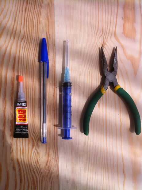 Para este proyecto va a necesitar una jeringa, un bolígrafo bic, pinzas y pegamento.