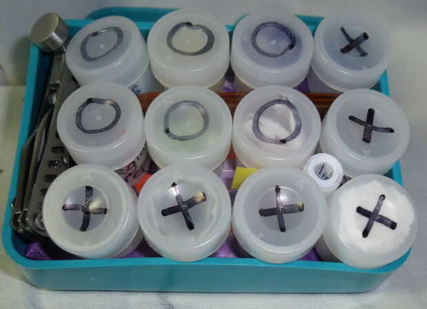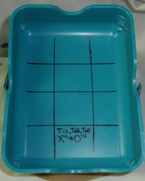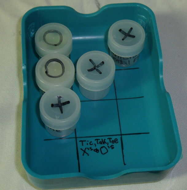 pensé esto después de ser inspirada en todos los kits de Altoids, frascos Nalgene el no caben en una de esas latas usé una Jabonera de viaje sin uso que tenía. Usé los frascos para que una pequeña cantidad de consumibles se podría llevar sin preocuparse por fugas o Cruz contaminación con otros objetos en el juego. Desde que tuve 12 frascos del mismo tamaño, decidí hacer un juego así. En Canadá se llama x y de O, nos Tic, Tac, dedo del pie, en la UK en raya. Dibujé el tablero en la tapa con un marcador permanente.