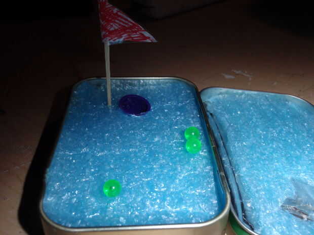 hice esto después vi otro instructivo por "trashermanTotalDIY", por lo que no puedo tomar el crédito. Vi que en su "kit de aburrimiento miniatura" tenía un pequeño, un campo de golf hoyos. Decidí hacer mi propia. Para el taladro, corté un pedazo de la tapa de un marcador, y la "hierba" utilicé poco viejos envases de espuma (reciclada de mi viejo "3 pies Cerbatana de metal"). Hice una bandera con un palillo de dientes y papel, y usar pelotillas del bb como pelotas de golf. No he hecho un club de golf, así que yo sólo uso mi dedo. El curso entero está contenido en una lata Altoids, y planeo hacer otro curso de un agujero en el interior de la tapa. Como dije, no es mi idea, justo mi versión de uno ya hecho. ¡Que te diviertas!