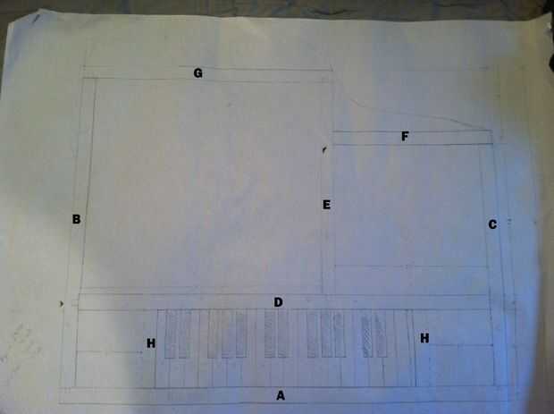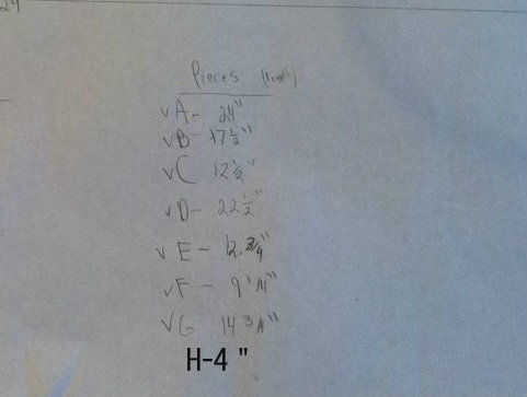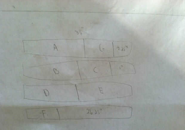 El siguiente paso es cortar todas las tablas a la medida. Utilicé una sierra de mesa para hacer esto porque vio mi brazo radial elige un muy mal momento para dejar de trabajar. Si tienes un brazo radial vio o vio alguna Sierra que puede cortar el ancho de las juntas que no sea una tabla te recomiendo usarlo. La Sierra de mesa llevada a unos cortes irregulares. Encima es la longitud que cada pieza debe ser. Todas las tablas deben tener un espesor real de 3/4 y ancho de 11 y 1/4, excepto para tablas E, D y el H Los tableros deben ser menos ancho de 1/4 (3/4 de 11) en orden para la parte posterior de la madera contrachapada a nivelarse.