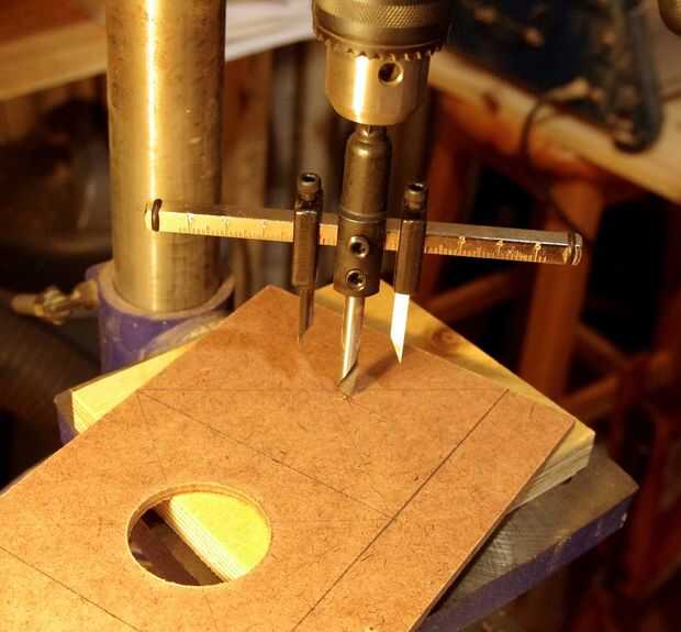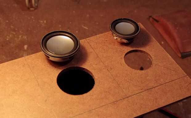 Quiso poner a prueba un 50 mm y un altavoz de 40 mm y por supuesto tuvo que hacer las aberturas de los tamaños adecuados en los bafles de la prueba. En la primera foto se acaba una abertura. Usé el peligroso artilugio buscando en una prensa del taladro para cortar las aberturas. En la segunda foto son las aberturas acabadas en los deflectores, con los drivers correspondientes sentado junto a ellos. Los deflectores aserrados en tamaño después de eso.