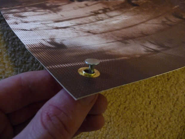 Colocar un clavo en el ojal superior de centro y unidad en la pared. Desde que el cartel es tan ligero, no necesita preocuparse por colocar en un poste de madera - yeso funciona bien. Ahora puede inclinar el cartel hasta que quede derecho, sugiero preguntar a un amigo a ayudar, y luego en las uñas en las otras esquinas.