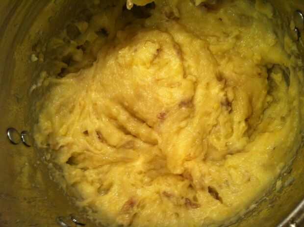 Tomar tus papas hervidas y convertirlas en puré utilizando la batidora de mano. Estos deben tener una consistencia mucho más delgada que el puré de papas normal y deben ser lisos con sólo pequeños trozos de patatas. A continuación, tomar 2/3 de la cebolla y mezcla a las patatas. El aceite que las cebollas eran salteadas en también debe agregar a las patatas trituradas.