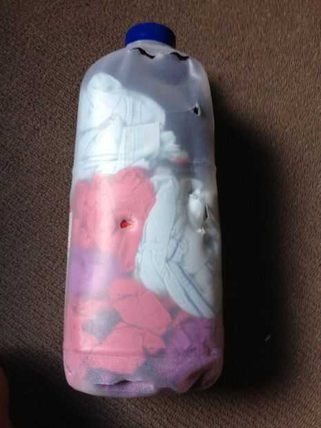 Corte encima de las camisas en trozos más pequeños y cosas en una botella de leche vacía.