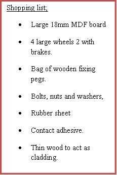 El siguiente paso es construir una elevación esto se proporcionar espacio para las ruedas se compone mediante el uso de un esquema más grande de la base y entonces tiene una gran cantidad de puntales MDF en forma que la sujetan hacia arriba y forma un ángulo. (ver imagen 2)