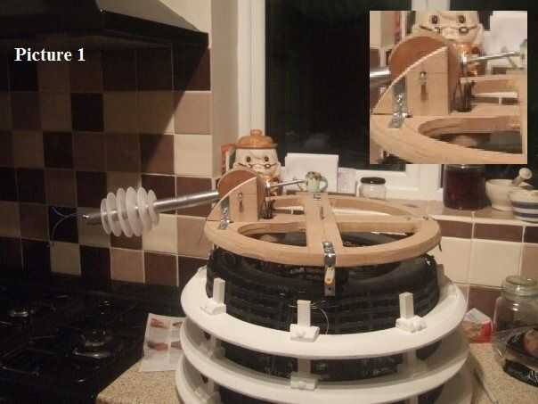 El control de ojo duplica como un domo girando. Es simplemente dos de aluminio o plástico tubos, uno fijo para el marco interior de la cúpula y los otros corriendo libremente alrededor de él. Un trozo de espiga dentro tiene un tornillo de fijación en posición y se fija a ojo-tallo por medio de una cuerda. El perno de fijación pasa a través de un orificio pretaladrado en el tubo exterior. Esto permite que el tubo exterior mover hacia arriba y hacia abajo como el tornillo sigue la ranura, luego pasa a través de un orificio que viene taladrado en el tubo exterior. Esto permite que el tubo exterior mover arriba y abajo como el tornillo sigue la ranura. Puede ser una pequeña muesca puede cortarse en el punto medio para permitir que el tallo de ojo para fijarse en posición horizontal cuando no utilice lo Dalek. El tamaño de esta unidad es dependiente del operador, que debe ser cómodo utilizarla.