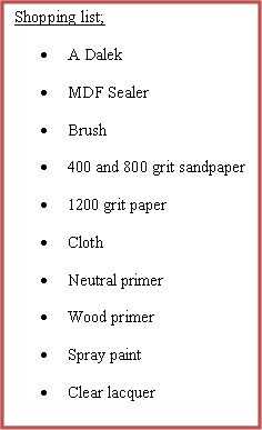 Limpie el polvo con un paño y agua jabonosa culos la superficie cualquier imperfección y usan más la cartilla para completar cualquier arañazos. Una vez seco usar 1200 mojado y seco para plano detrás. Repita este proceso hasta su donde su feliz. Elimine todo el polvo y pulir frotando enérgicamente con un paño limpio y seco. Utilice trapos de tachuela para quitar cualquier polvo antes de rociar. Rociar la superficie superior con una cartilla neutral que es afín a la capa superior del Daleks y es también químicamente neutra y por lo tanto es improbable que reaccionan con la cartilla de madera abajo. Aerosol en color de la capa superior y añadir una capa de barniz transparente para un acabado ultra brillante.