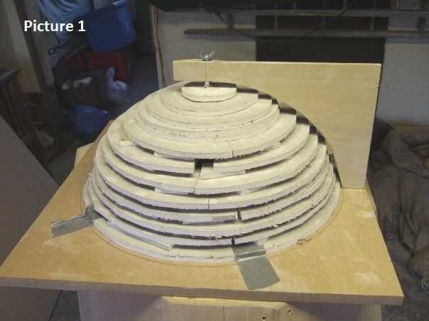 A partir de ahí vamos a empezar con la cabeza o cúpula. El método principal detrás de la forma de cúpula es crear un perfil plano medio anterior de madera o un material resistente similar. Esto entonces se une a una base de madera con una varilla roscada, tuercas y arandelas. El anterior entonces se puede girar 360 grados, cuando el yeso se coloca bajo el anterior que está moldeado en la forma de la cúpula.