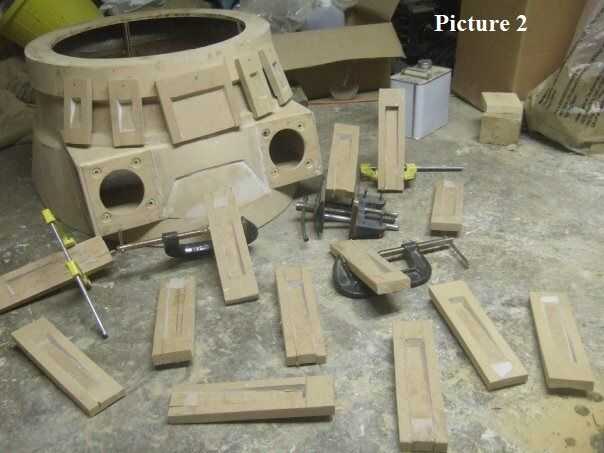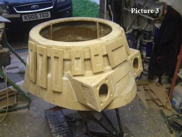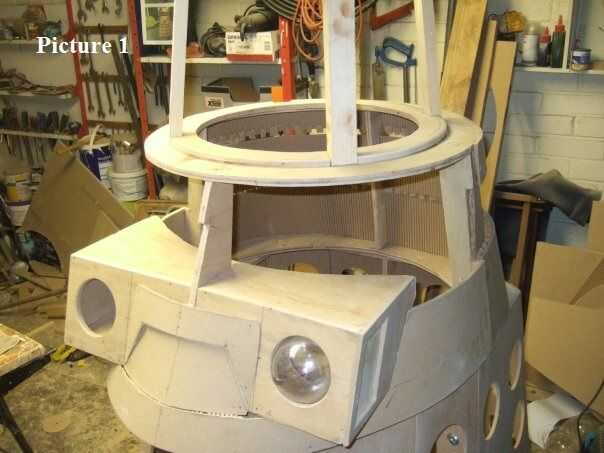 Utilizando a un asistente, panel pernos, pegamento para madera y un montón de abrazaderas (Foto 2) Conecte las secciones a la estructura. En ese momento debe utilizar la estera de fibra de vidrio para el exterior para comenzar a construir la piel de lo Dalek. Cuando los hombros todo revestidos, utilizar mat de vidrio y resina para reforzar el interior. Ejecutar las tiras de fibra de vidrio alrededor de las costuras de la caja de arma y también los puntos de encuentro, entre las secciones de la piel si se desea agregar robustez extra a la construcción mediante la ejecución de las tiras alrededor de los puntos donde se unen los paneles superior e inferior del marco los lados.