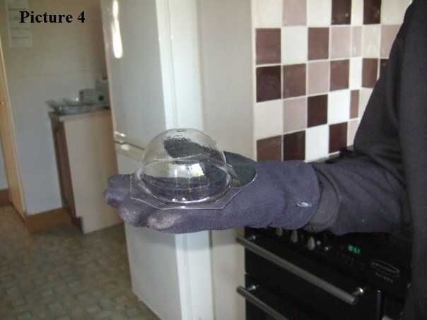 Esto entonces se pone en el horno durante unos minutos calentar y hacer moldeable. (Ver cuadro 3). Esto entonces se presiona sobre el molde negativo y el izquierdo para refrescarse y fijar (véase cuadro 2). Quite el hemisferio desde el molde y recortar. (Ver imagen 4) El último paso entonces es grafitear el color necesitado y si desean usar aislamiento spray de espuma para llenar y fortalecer el diseño.