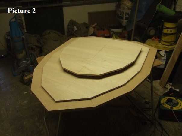 Su elegido que Dalek determina las dimensiones de los marcos superiores e inferiores, que éstos producen 3 diferentes capas tamaño que ponen encima de la otra (Foto 2) y luego el círculo de centro cortan para dejar espacio de pie. Si usted está construyendo directamente sobre una base hecha de antemano para el posicionamiento, (que es lo que hicimos, sin embargo se podría agregar la base después) necesita marcar solamente el donde la falda debe seguir el perímetro de la base para la colocación de los puntales verticales y los paneles.