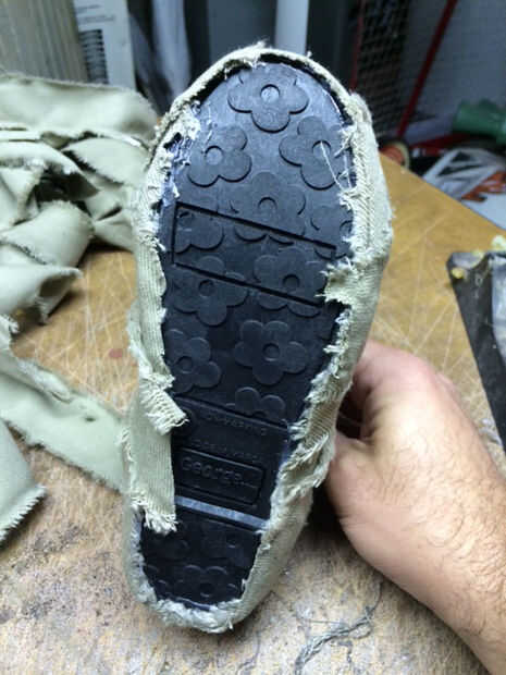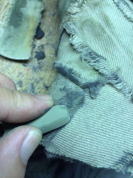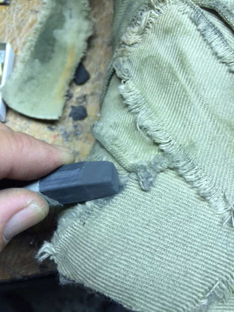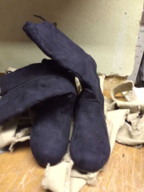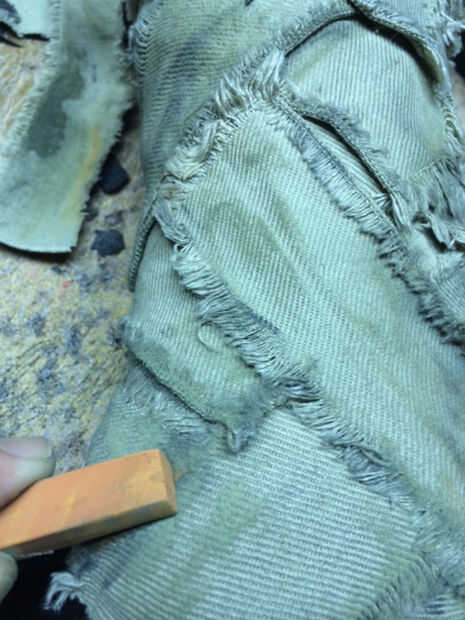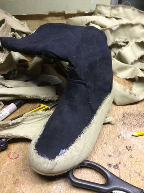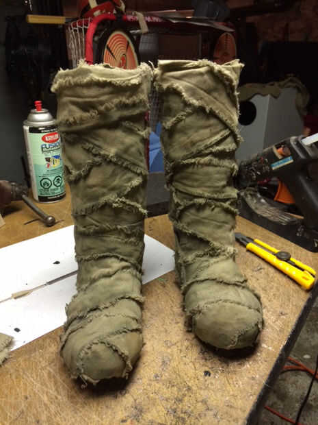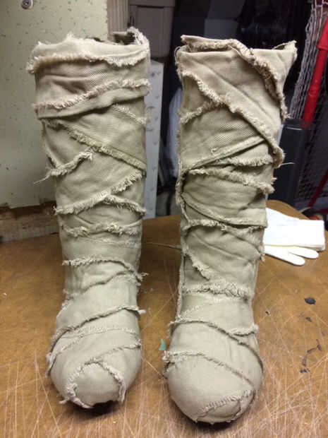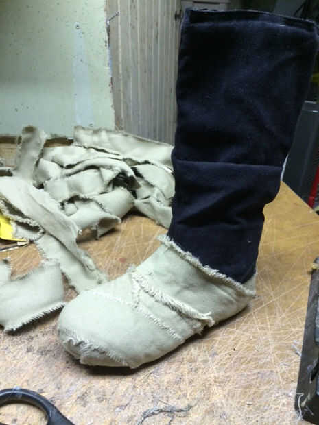 He comprado un barato par de botas de la niña para el traje como que quería algo largo y que se ajusten cómodamente alrededor de la pierna. Las botas fueron tratadas y resistidas de la misma manera que la cabeza. Caliente pegué las tiras alrededor de la bota - dejando la planta del pie desnudo y resistido con la misma combinación de colores de tiza pastel.