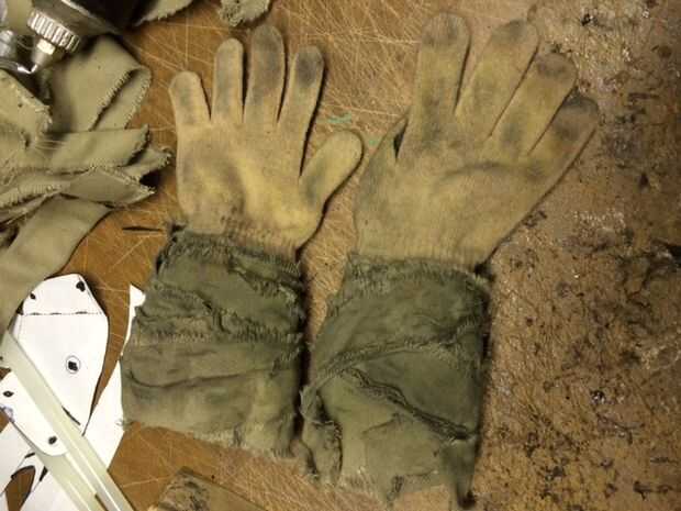 con el té. El color fue un poco fuerte para mi gusto así que rocía los pesadamente con negro después finales fotos fueron tomadas. Caliente pegadas tiras de tela - otra vez con la misma técnica como la cabeza y botas, los guantes para ocultar cualquier muestra de piel.