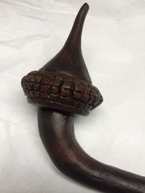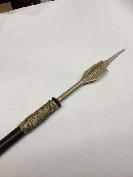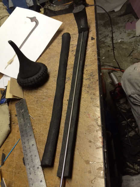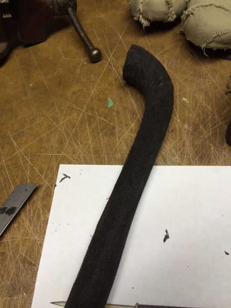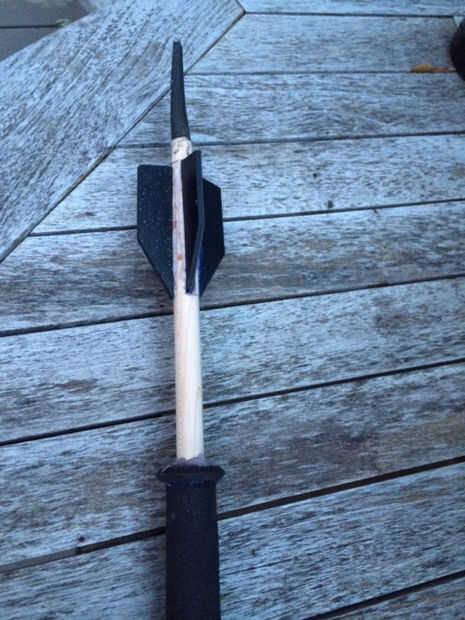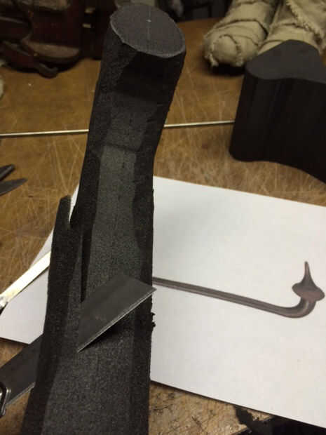 Se ha añadido otra pieza de espiga hasta el final del eje tallado para actuar como la extensión de acero en el Gaffi. Las aletas fueron creadas con sintra y la punta afilada fue tallada fuera de la espuma plastazote por razones de seguridad. niños de 7 años de edad y armas afiladas son potencialmente peligrosas.
