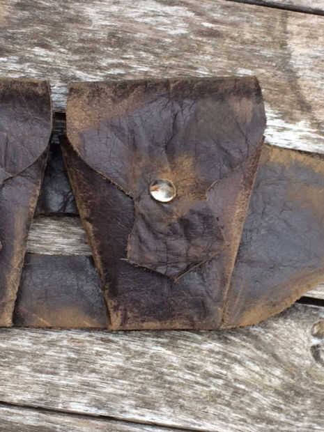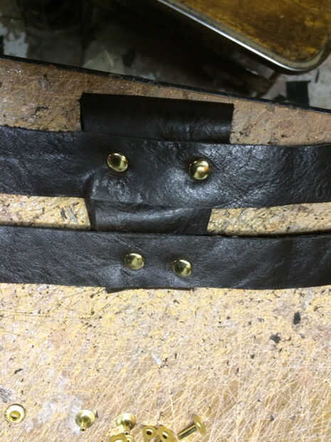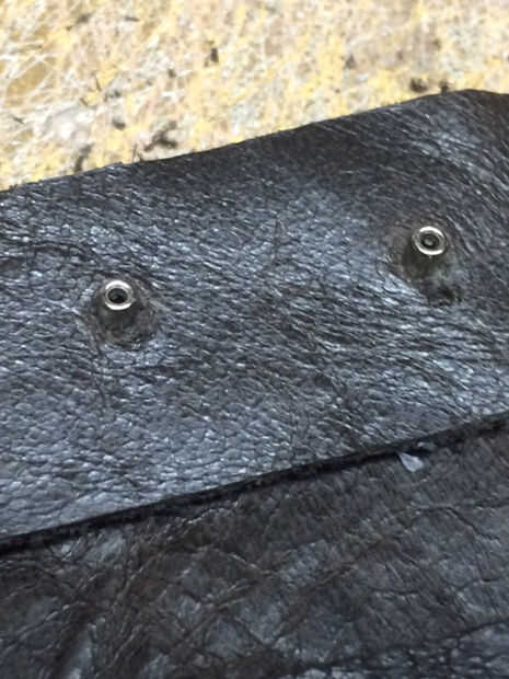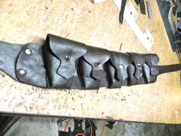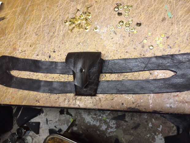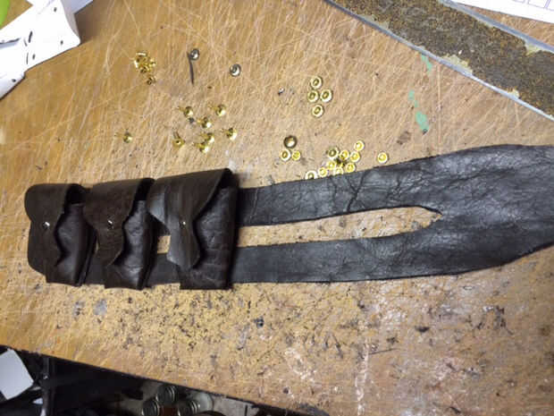 En este caso, usé remaches para sujetar las bolsas de plegado a la bandolera. 4 remaches fueron utilizados y penetraron la bolsa y la correa a la vez. Remaches rápidos fueron utilizados en lugar de los botones de Sam Brown (presupuesto)