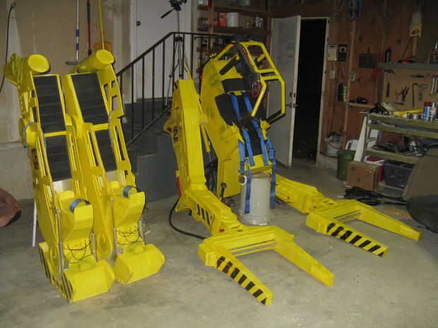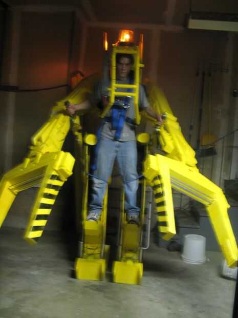 En cuanto a ser capaz de moverse en la cosa, bien, fui capaz de "caminar" en él. Los pasos eran bastante pequeños, pero pude levantar mis pies del suelo y dar un paso. Los brazos eran difíciles de equilibrio (el tamaño de las pinzas les hizo muy pesado de frente), pero me sorprendió lo alto podía levantarlas. Podría conseguir las pinzas como alta o superior de mi cabeza. Los mangos tuvieron que ser reforzada para asegurarse de que las piezas de PVC no sólo salga el conector cuando levanté los brazos.