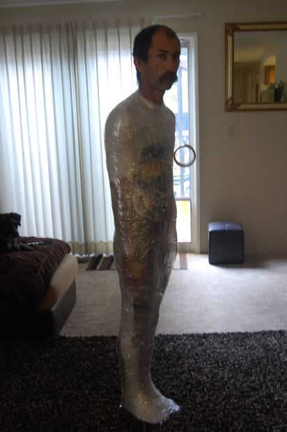 Ahora usted puede cortar el rollo de plástico si no utilizas todo el rollo. Y la verdadera diversión comienza otra vez sin necesidad de cortar la envoltura de la cinta la persona sobre la envoltura de plástico con la cinta correo traslapando cada abrigo por 1/3 a 1/2 el ancho del rollo de cinta. Esto es vital para mantener la forma rígida y proporciona un shell para trabajar con para mantener la forma. Abrigo de la parte superior de los pies hasta la base del cuello y hombros al igual que en la imagen. Desea utilizar una envoltura alrededor de todo el cuerpo. Después de esta envoltura desea una segunda capa con tiras de cinta subiendo y bajando por la persona de la cinta. Asegúrese de pulsar hacia fuera las arrugas de la cinta a medida que agrega más cinta. Cada capa de la cinta debe ser de aproximadamente 90 grados a la capa anterior. Este método añade un montón de fuerza y es vital para la cáscara, tipo de como hacer una "cinta de fibra de carbono". Corte tiras como sea necesario, alternancia y superposición de los extremos para que usted no termina con una línea débil en un área del cuerpo.  La última capa de la cinta es una envoltura final alrededor del cuerpo como la primera capa de la cinta.