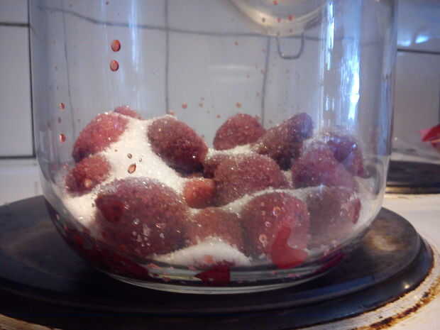 - 1, 5-2 dl de vodka/Ron y 1,5-2 dl de azúcar por cada litro de bayas