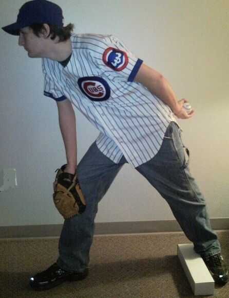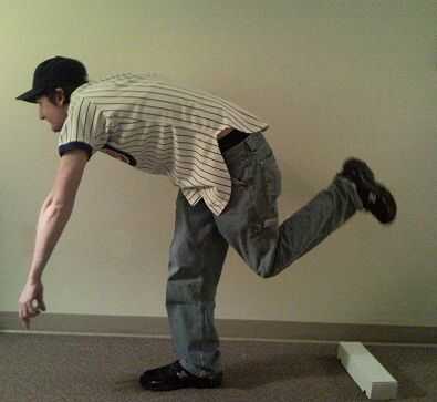 1) Coloque el pie lanzamiento de modo que el interior de tu pie esté en contacto con el borde posterior de la goma. Estirar el pie del guante hacia el montículo para que estén equilibrados y curva hacia la placa que buscas en el colector de muestra. Te recomiendo sosteniendo la bola detrás de la espalda y descansa su guante sobre su rodilla.