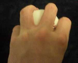 b) Nestle el dedo corazón contra el interior de la parte superior fuera de la costura y el dedo índice contra el dedo medio. El pulgar debe estar en el centro de la curva inferior de herradura.