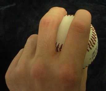b) en vez de colocar el índice y el dedo medio en las costuras, usted debe colocar su dedo del medio, así como el dedo del anillo en las costuras. Su pulgar debe estar en la parte inferior de la bola hacia arriba hacia la separación entre los dedos.
