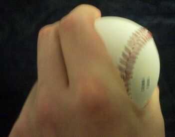 b) agarre la bola de modo que el pulgar está en la parte inferior dentro de la costura y el índice y el dedo medio unen la parte superior fuera de la costura.
