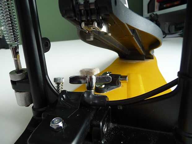 Un último paso estaba aplicando una pequeña almohadilla de fieltro para la parte superior de la tecla de abrazadera del tambor. Ya que no tengo una superficie para el batidor golpear, el pedal se estrellaría todo el camino hasta la pinza. También quité el batidor ya que estaba causando algunos rebotes extra (otra vez puesto que no había ninguna superficie dura para detenerlo).