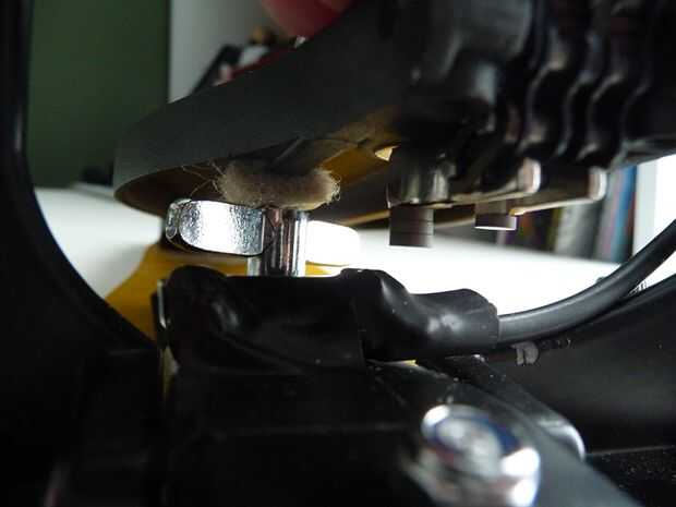 Con mi pedal particular, colocar el interruptor en la abrazadera del tambor elaborado mejor. Sólo usé algunos cinta aislante para sujetar el interruptor y unas abrazaderas de plástico para fijar el cable. Los imanes se sientan en la parte inferior del pedal sobre un soporte que sostiene la cadena y son lo suficientemente fuertes como para que no se muevan sin pegar hacia abajo.