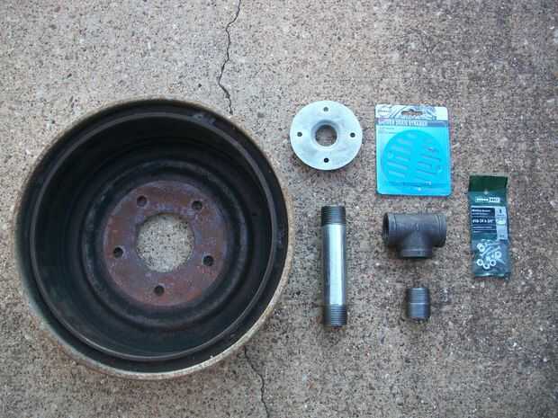 Recogí el tambor de freno en mi yarda local de la demolición. $10 para el servicio del uno mismo y no faltan los sueltas esparcidas por la elección. Probablemente pasé más tiempo echando un vistazo posibles nuevos proyectos que hizo escoger un cuerpo para mi fragua. Entonces me detuve mis favoritos Home Depot para el resto de las fuentes. Recogí una 1" brida del piso para la parte inferior de mi fragua con un drenaje de ducha estándar para el interior de la rejilla. Fue con una juego cerca boquilla de 1", 1" t y otra boquilla de 6" para mi suministro de aire. Enredarse algunos #10 tuercas y tornillos para las conexiones y se dirigió a la casa.