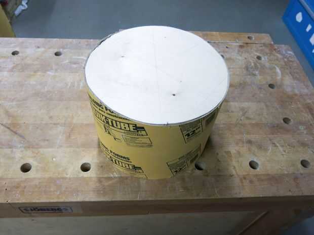 Marcar el tubo algo de madera y encontrar el centro del círculo. Recortar el círculo para que encaje perfectamente a la parte superior del tubo concreto. Nuestro círculo tenía un diámetro de 11.5"(el diámetro interno del tubo concreto).