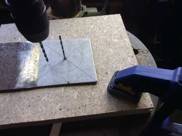 Luego fije con abrazaderas el zócalo firmemente a la mesa del taladro con el centro del taladro de 4mm de la circunferencia del círculo. Asegurado de esta manera que podía sistemáticamente perforar una serie de orificios alrededor del círculo, están lo suficientemente juntos - Ojalá - para que el centro podría ser perforado hacia fuera.