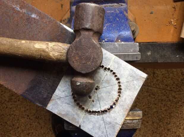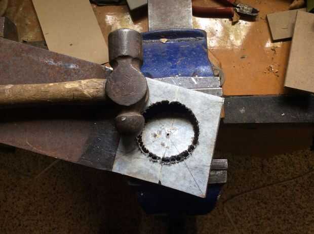 Abrir el vicio a un poco más grande que el círculo y usando un martillo de pein de la bola - golpear cerca de los orificios y seguramente bastante el metal restante entre las lágrimas de agujeros lejos.