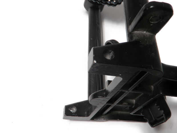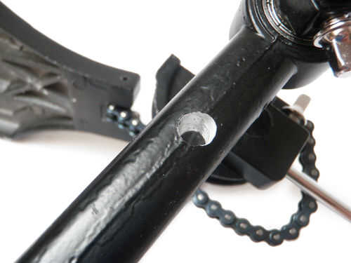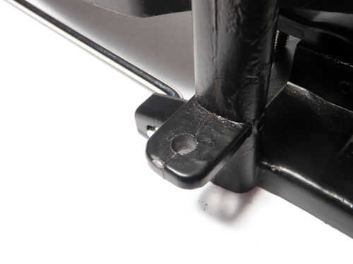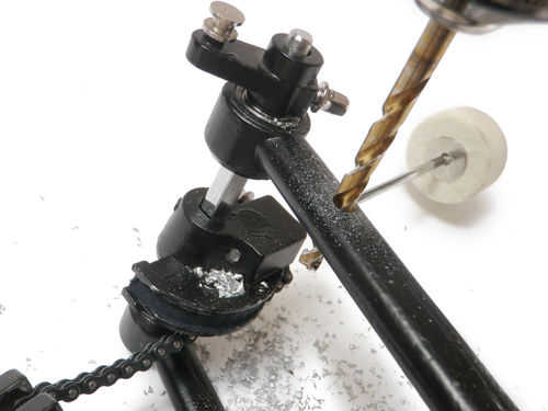 Utilizando los orificios de montaje en el soporte de madera como guía, perfore 1/4" agujeros en ambos lados del pedal. Esto debe resultar en 2 orificios a cada lado del pedal.
