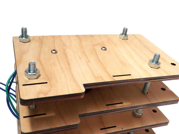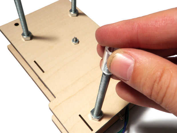 Deslice a un espaciador en cada uno de los pernos y luego enroscar las tuercas más para mantener todo en su lugar.