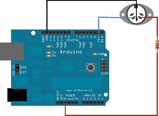 Lo primero que querrá hacer es alambre a tu Arduino a tu hembra MIDI para que pueda jugar notas MIDI.  Este es un proceso fácil: sólo tienes que seguir el diagrama! Observe que el resistor de 220 ohmios.