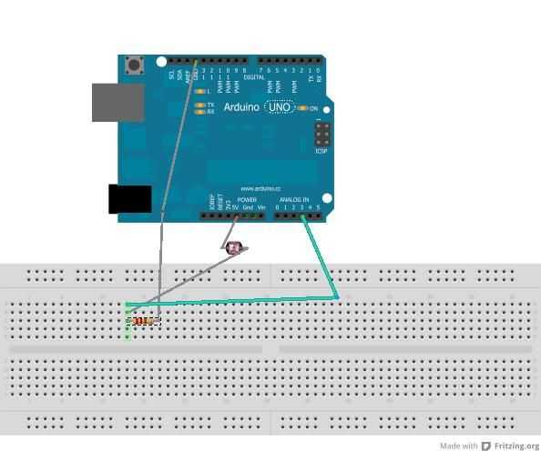 El pedal de hi-hat funciona utilizando una fotocélula como un divisor de tensión. El siguiente diagrama muestra cómo engancharlo (otra vez, usando un cable usb como conector). Tenga en cuenta que el valor de la resistencia es de 10k, y que la mitad del divisor de tensión debe estar conectada al Analog Pin 3, como se muestra.
