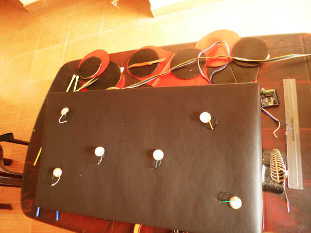 • Ahora corte las ranuras pequeñas, donde quiere fijar sus pads de la batería. Se encamine nuestros alambres de allí.