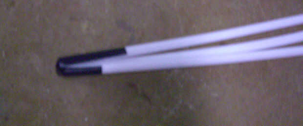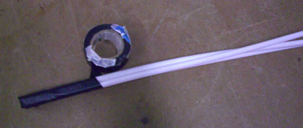 Para pegar los palitos juntos, empezar por un pequeño trozo de cinta de embalaje sobre el extremo no redondeada de los palillos. Entonces espiral la cinta encima de los palos hasta llegar un poco menos de la mitad, círculo alrededor de un par de veces y luego en espiral hasta la parte inferior y cortar la cinta.